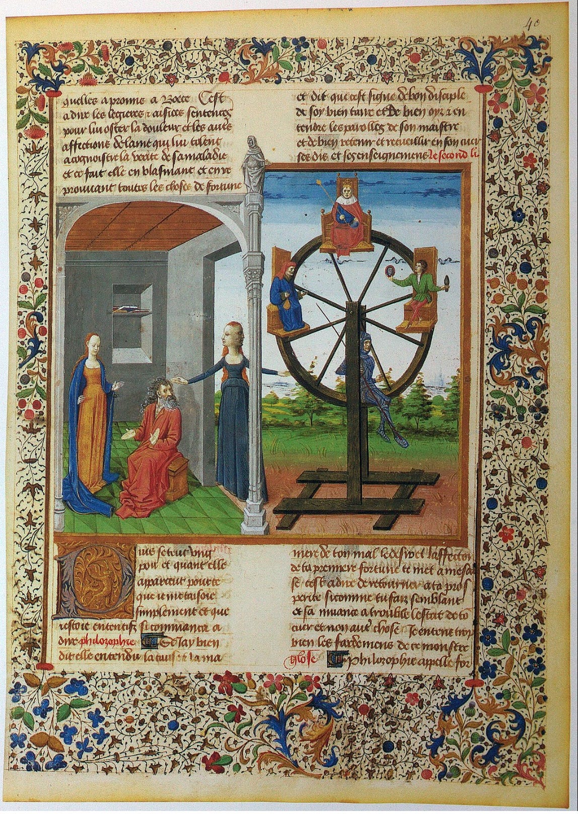 A page from a medieval French translation of Boethius’ On the Consolation of Philosophy (523 AD). One of my favourite medieval images, it (on the left) shows a decidedly big-bearded Boethius being lectured at (and patted kindly on the head – ‘There, there, Boethius; I know this is all a bit complicated, but do try to keep up’) by the very wise and wonderful Lady Philosophy, who can see in at least two directions, see at least two sides of every issue, or apply at least two varying types of knowledge to any given situation, depending on your interpretation of the character and her message. (On the right side of the image is the Wheel of Fortune. )