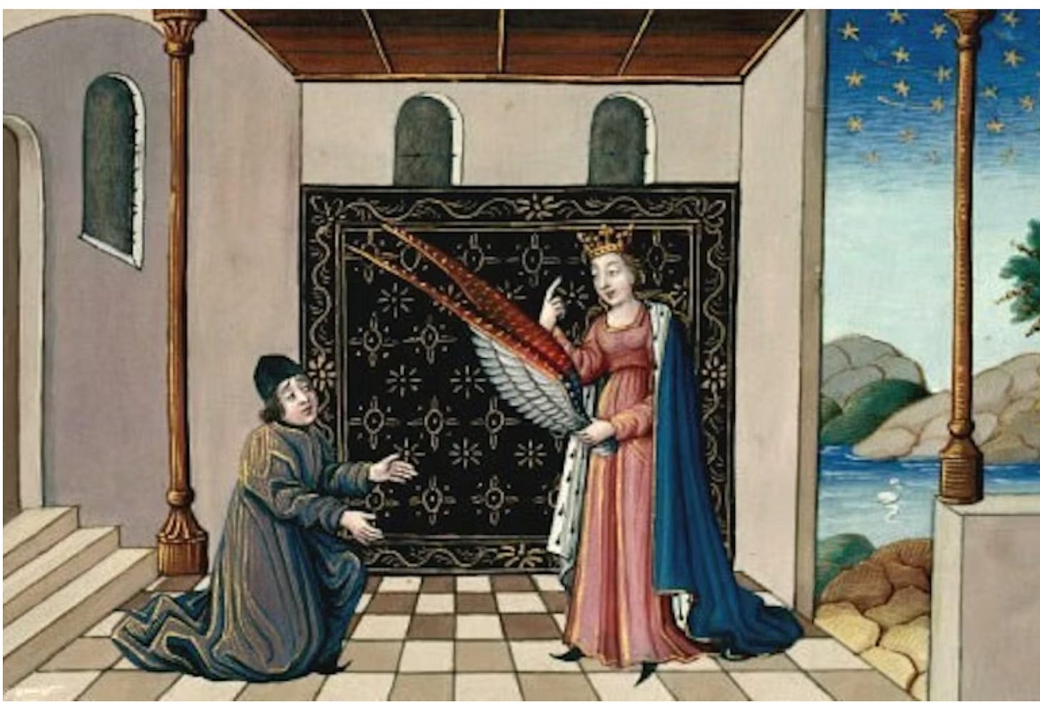Lady Philosophy offers Boethius wings, so that his mind can fly aloft. (No big beard in this one, but at least he’s on his knees.) The French School, 15th century.